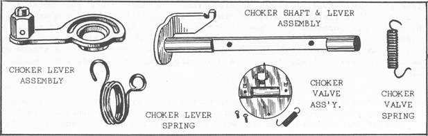 The choke system is incorporated in the carburetor, for the purpose of richening the mixture ratio for cold and semi-warm engine starting and operation. The choke is built into the carburetor air horn and consists of a round flat valve that has almost the same circumference as the inside of the air horn. It is mounted on a shaft that reaches from side to side in the air horn.